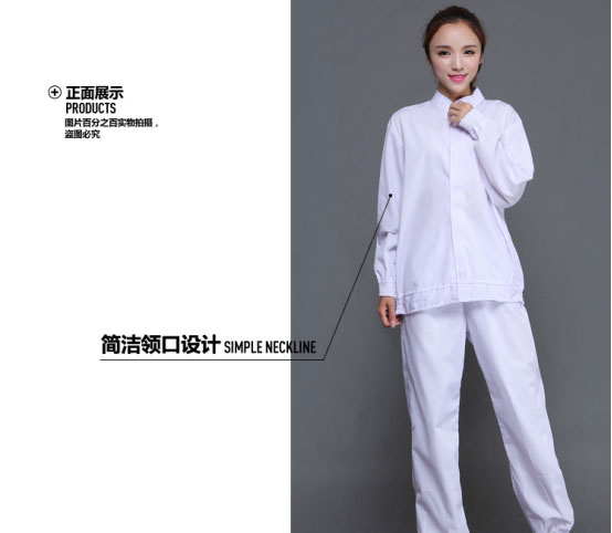 生区工作服洁净要去相对较低,一般会选用白色食品分体套装,衣服的袖口领口处都是收紧的。款式要求非常简单,无口袋即可。面料多数为高棉或者专用医护洁净高棉面料。目前很多食品单位定制的就是这种白色食品服。